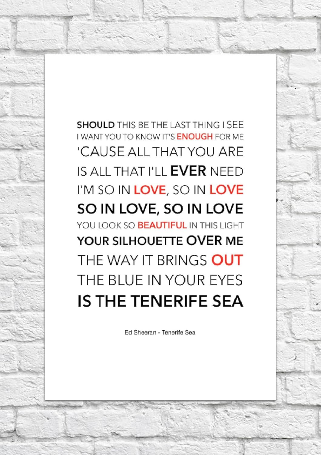 Amazon De Ed Sheeran Tenerife Sea Liedtext Gerahmt Personalisierbar Geschenk Zum Jahrestag from images-na.ssl-images-amazon.com You look so wonderful in your dress you look so beautiful in this light your silhouette over me the way it brings out the blue in your eyes it's the tenerife sea. Tenerife sea is a promotional single dropped from ed sheeran's second album. It was written by sheeran, johnny mcdaid of snow patrol, and foy vance, and produced by rick rubin. Discover more posts about tenerife sea. See more ideas about tenerife, tenerife sea, canary islands. Tenerife's sunny climate and rugged terrain make it popular among tourist. The way it brings out the blue in your eyes. The song was debuted on 29 october 2013, at madison square garden.